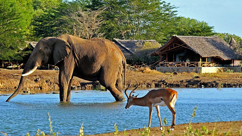 - What it is: Luxury tented camp inside Tsavo East National Park, Kenya, built around a permanent waterhole.